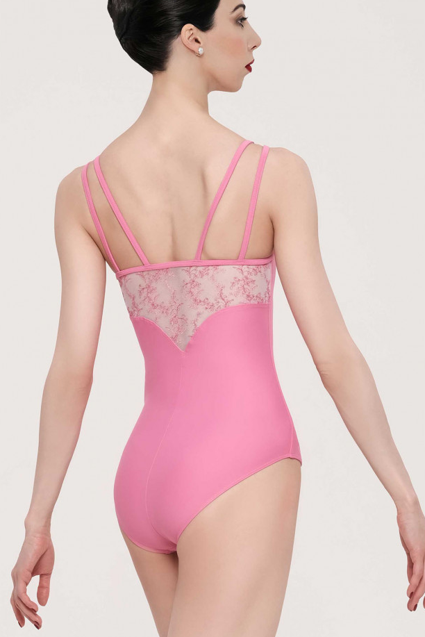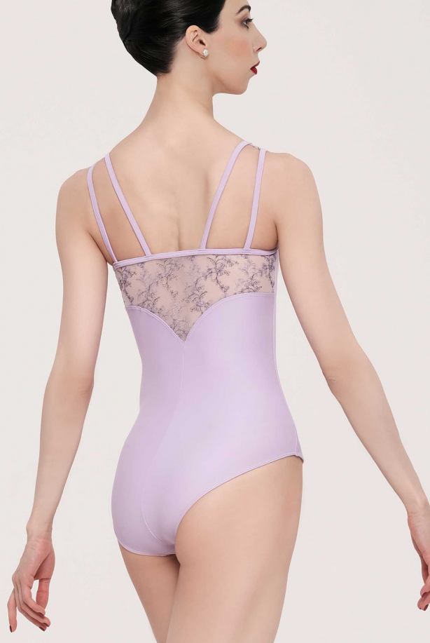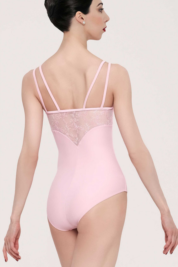 Maillot de Danza para Mujer – Colección Mademoiselle. Este elegantísimo maillot camisola de doble tirante se encuentra a medio camino entre la lencería y la moda. Un tul transparente bordado conecta los tirantes con el escote corazón delantero y la parte superior de la espalda. La espalda se realza aún más con un panel de tul cónico. Este maillot está confeccionado con nuestra microfibra de elastano y combinado con tul elástico bordado, cuya transparencia crea un contraste con la piel.