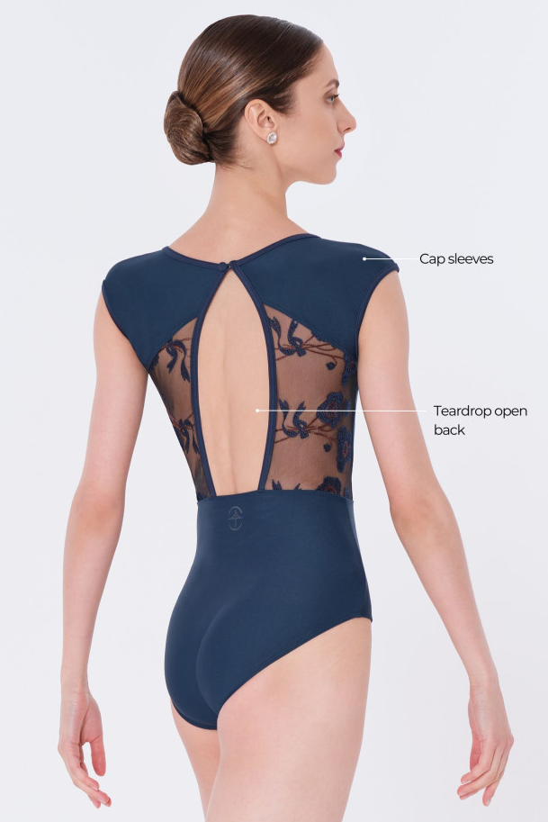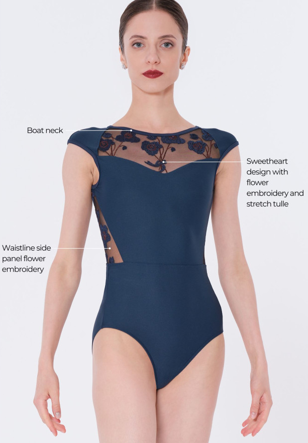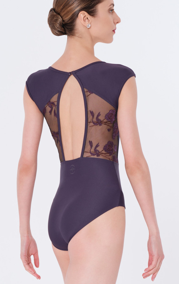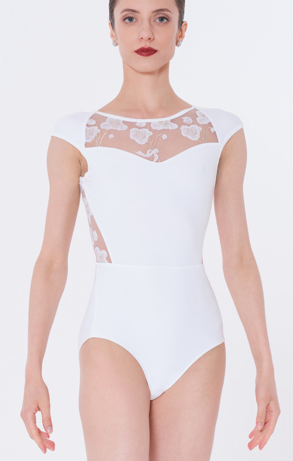 Descubre el maillot MUSCARI, una pieza elegante y versátil. Este maillot de manga corta presenta un escote de corazón adornado con una inserción de tul bordada con motivos florales, que añade un toque de feminidad y refinamiento a tu atuendo. Este maillot es una opción imprescindible para las bailarinas que buscan estilo, comodidad y calidad.