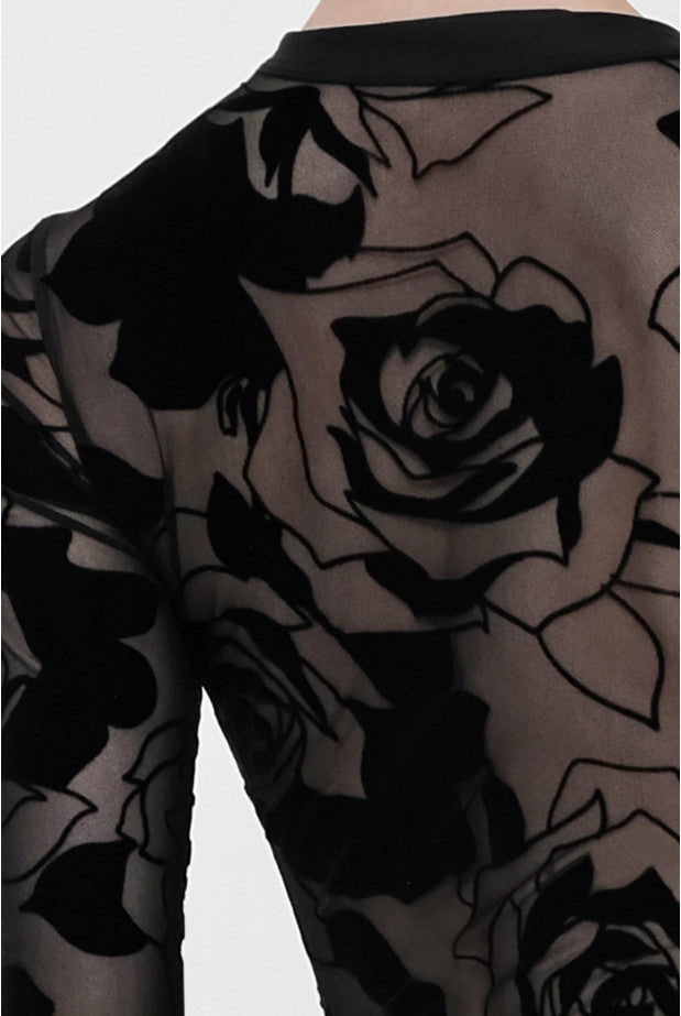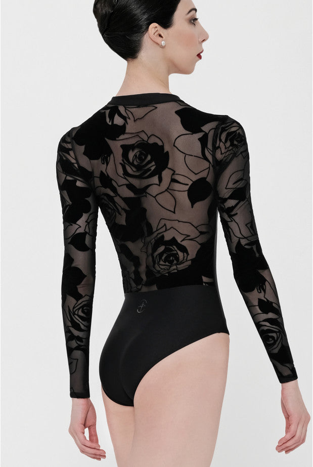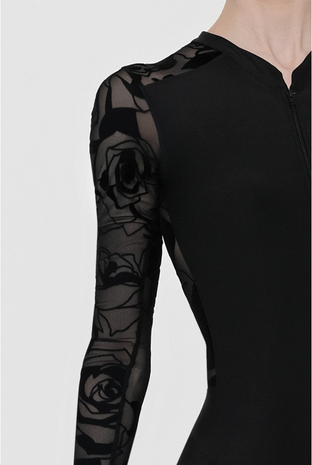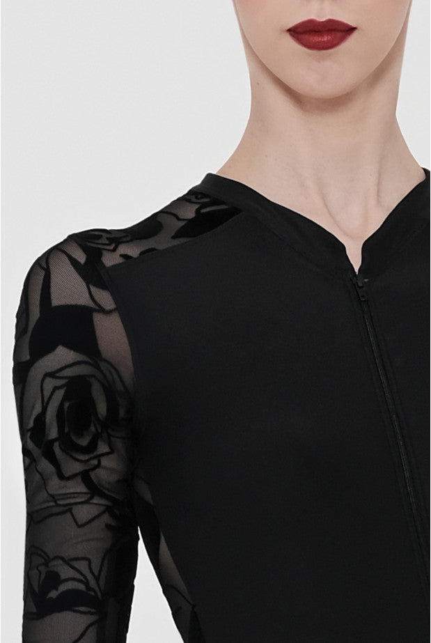 ● Mangas largas ● Cuello alto con cierre de cremallera frontal ● Espalda y mangas transparentes ● Tul flocado transparente con rosas de fantasía ● Disponible en 1 color ● Forro delantero ● Microfibra - Tul elástico flocado